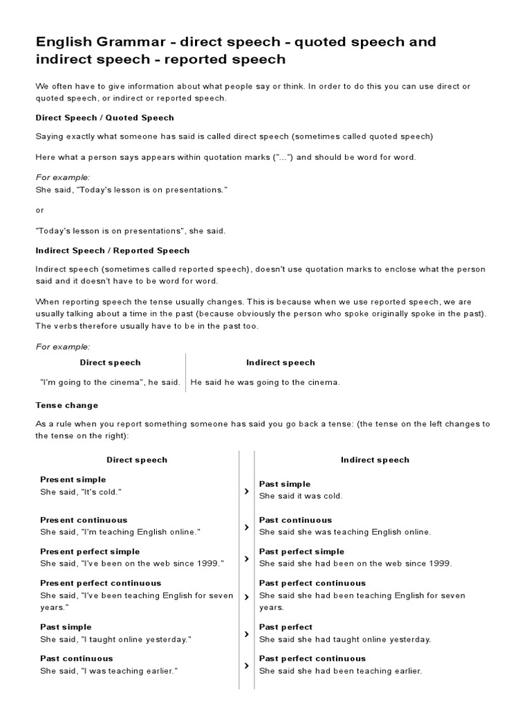 How To Learn Direct And Indirect Speech Easily. First, call on one of your students and read out a simple sentence. Then, have the student report the information back to you first using direct speech, then using indirect speech. Repeat this process with a different sentence for each student until all the students have successfully reported back to …. 2/10/2015 · There are lots of reasons why you might want to report speech in English – and the most common way of doing it is by using direct and indirect speech. Read on to find out how to use these! Using direct speech. Using direct speech means repeating the spoken phrase or word exactly as it was said.. 2/2/2016 · You’ll want to use both direct and indirect speech a lot when you use English – so make sure that you are familiar with both of them, and can use them correctly! One effective way to practice is by keeping a little diary of what has been said around you – describe what people have said, and try to write a few examples in each form.. Direct Speech: the message of the speaker is conveyed or reported in his own actual words without any change. Indirect Speech: the message of the speaker is conveyed or reported in our own words. Example on Process of Conversion from Direct to Indirect Speech. a) Direct: Radha said, “I am very busy now.”.. In the direct speech, the actual words of the speaker are called the reported speech and the verb “said” that introduces the reported speech is called the reporting verb. The following points should be noted: i) In Direct Speech: The reported speech is put within inverted commas (“”)..